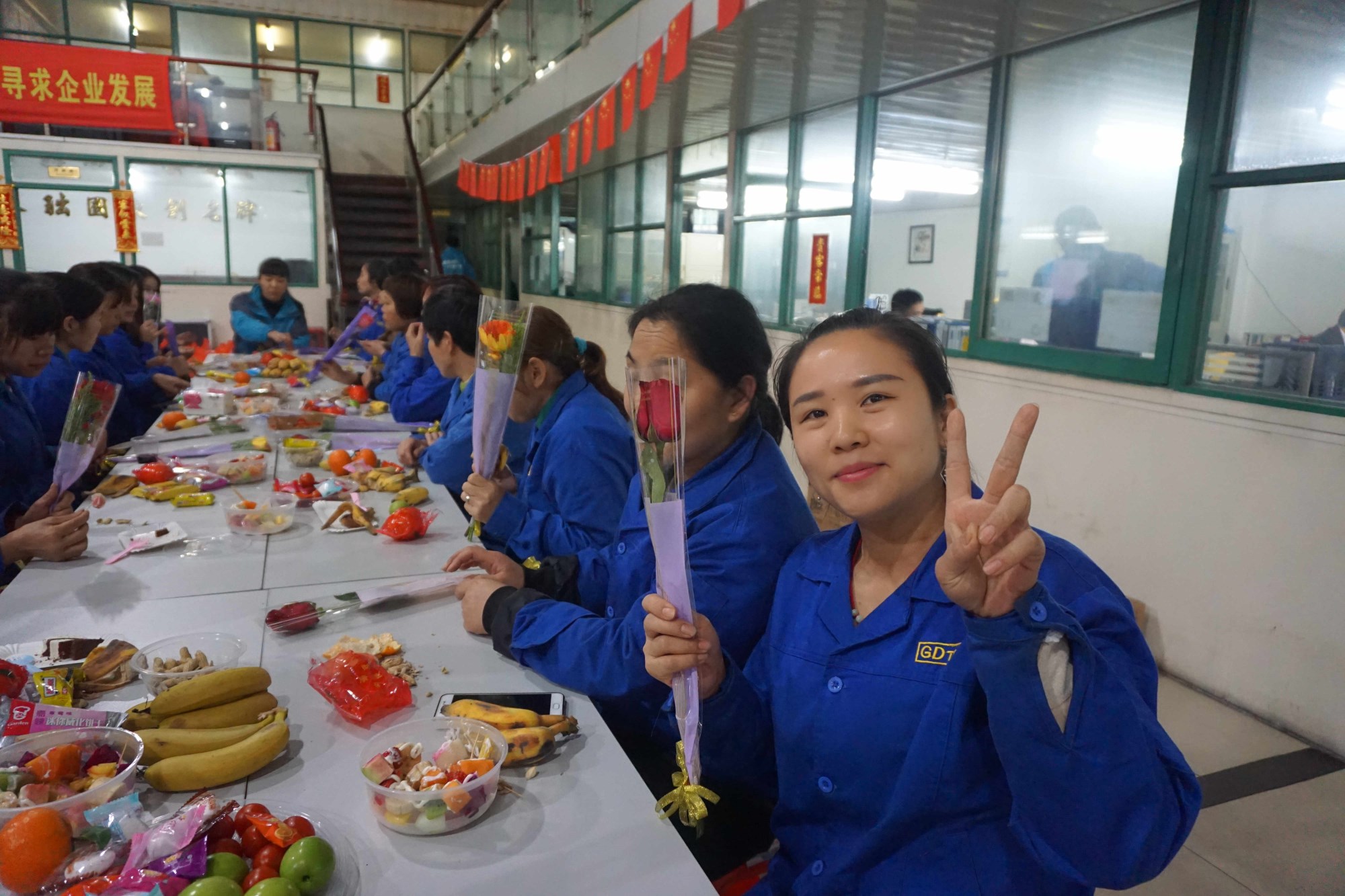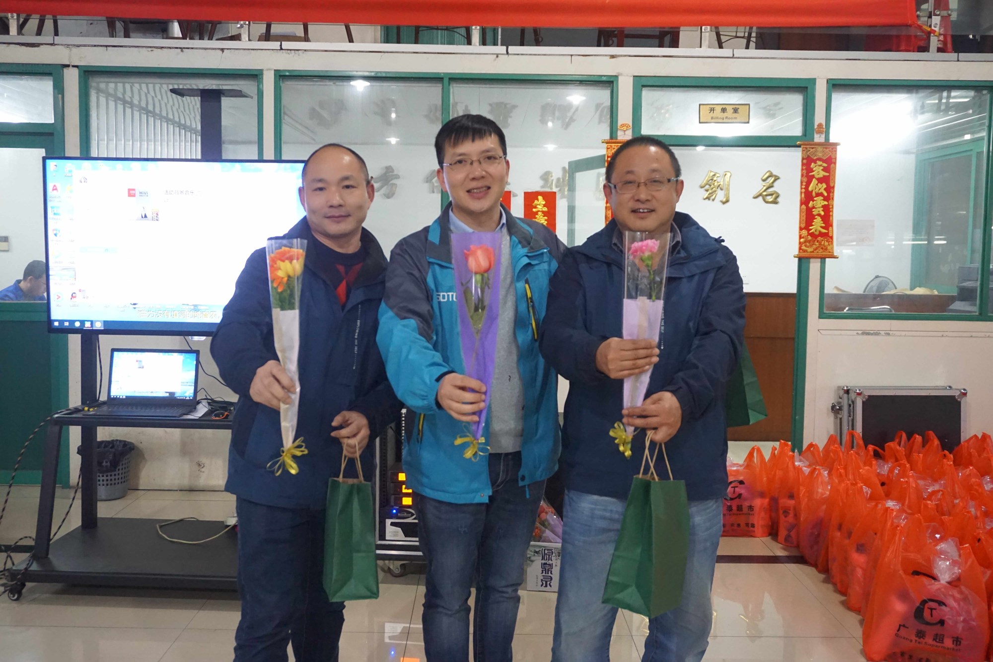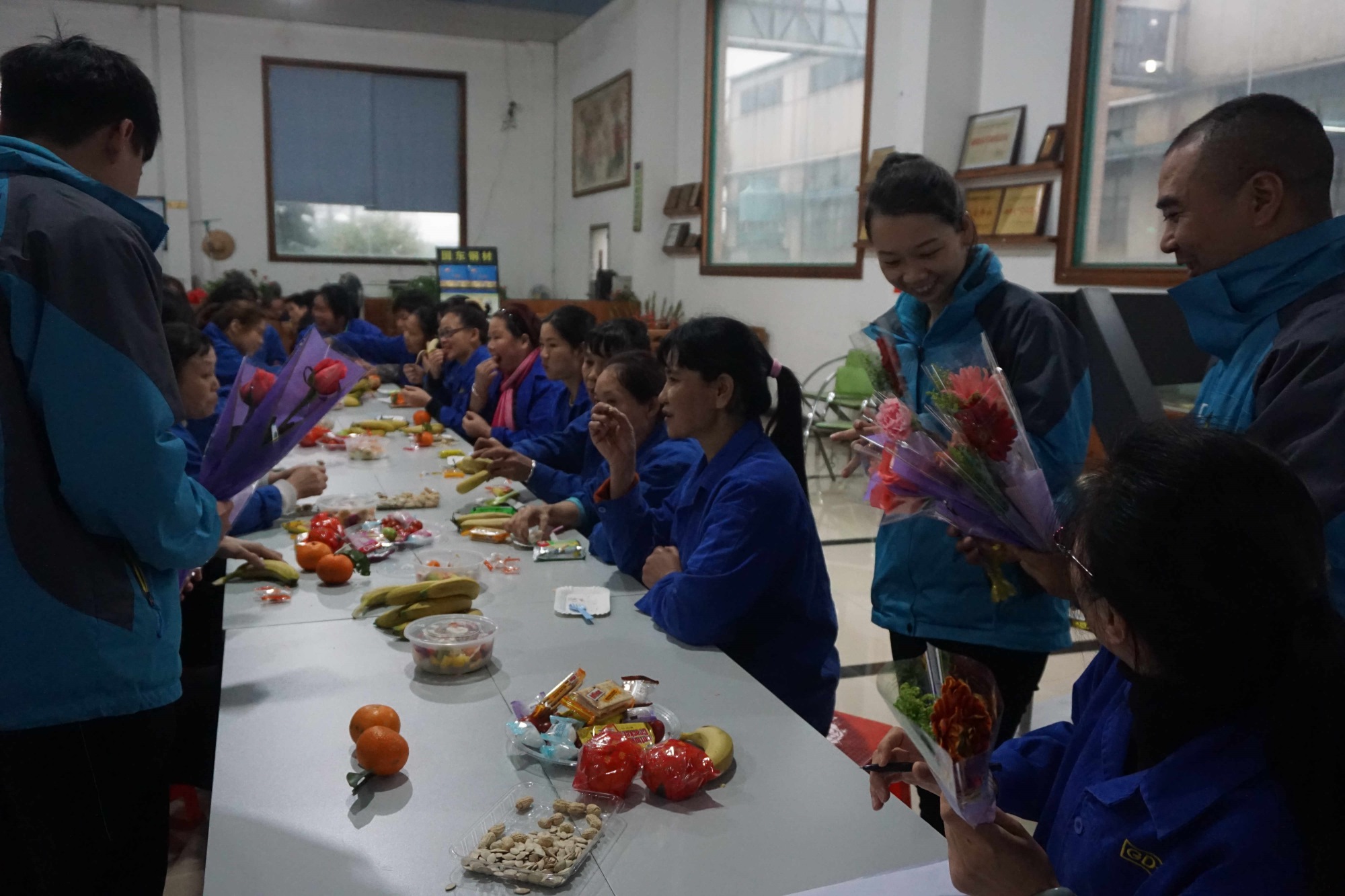 3月8號早7:30分,陰雨天,行政部及企業文化小組的成員就開始為下午的活動進行采購工作,采購水果、零食餅干、飲品、鮮花、禮品。同時在公司的婦女主任楊主任、各車間主任和TC成員開始組織男同事,出席下午“三八”女神節的獻花的活動。