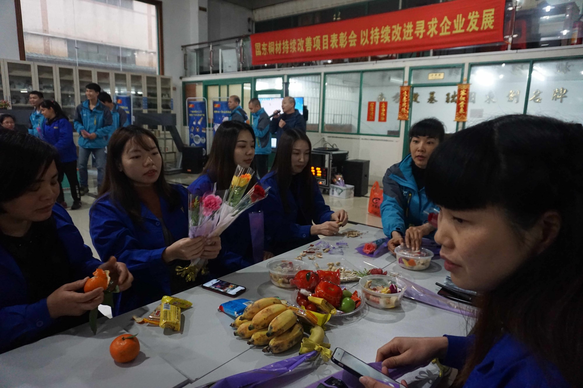 下午13:00分,由行政部同事、TC成員一起合力在辦公樓一樓大廳開始布置會場擺好桌臺,洗切水果做果盤、擺放零食、擺放禮品和鮮花,一切提前準備就緒。